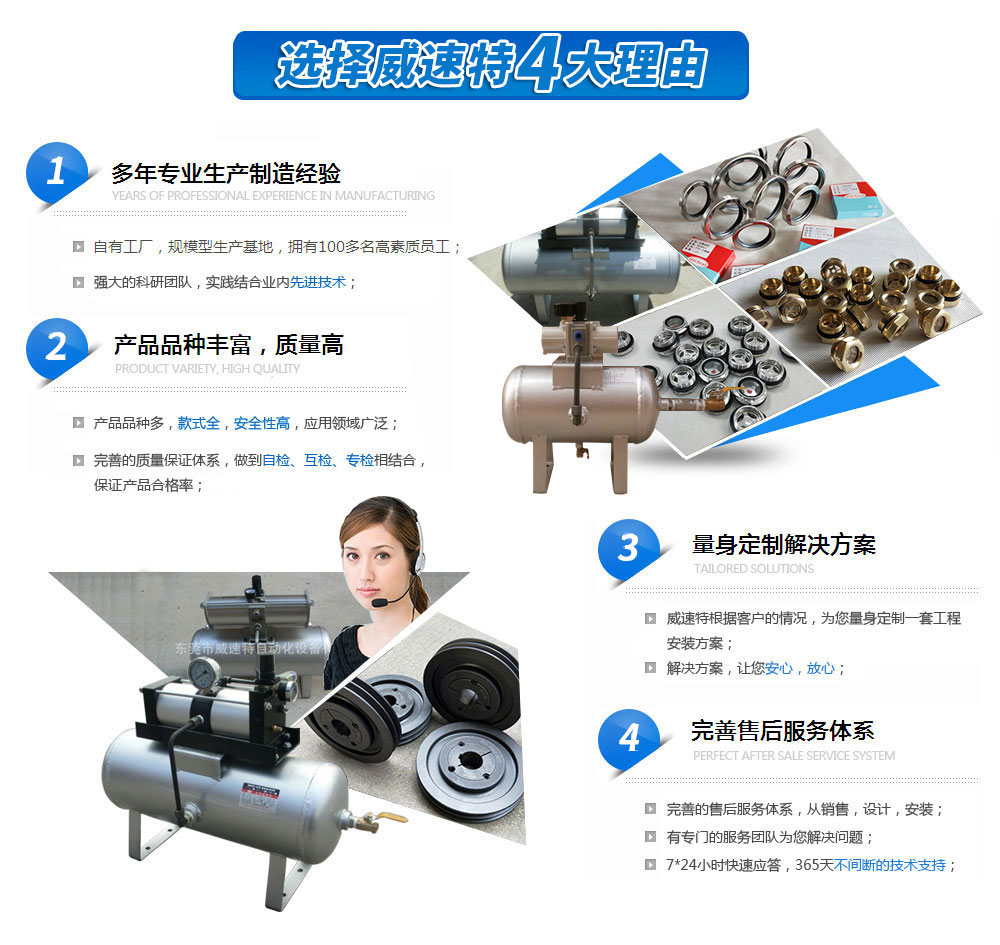 威速特自動化設(shè)備有限公司多年來致力于氣動設(shè)備省力改良。主要銷售自動化設(shè)備、通用機(jī)械設(shè)備、工業(yè)設(shè)備及配件、氣動設(shè)備及配件、五金機(jī)電產(chǎn)品等。主要產(chǎn)品有空氣增壓泵、氣動增壓泵、氣動增壓閥;儲氣罐;錐套式皮帶輪;電子排水器、空氣脫水器、觀油鏡、油標(biāo)、W962底座、油封、彈簧式安全閥、油路清洗劑、……[查看詳請]